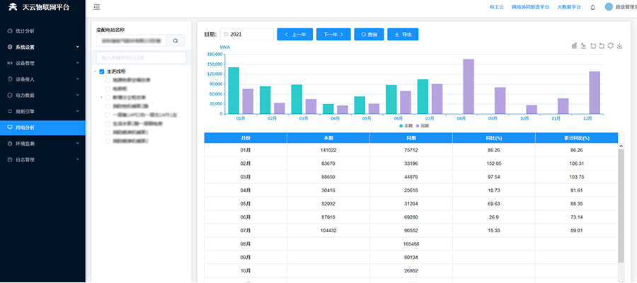 对被监控设备的用电情况进行统计分析,并可按不同的时间段进行同比和环比数据分析